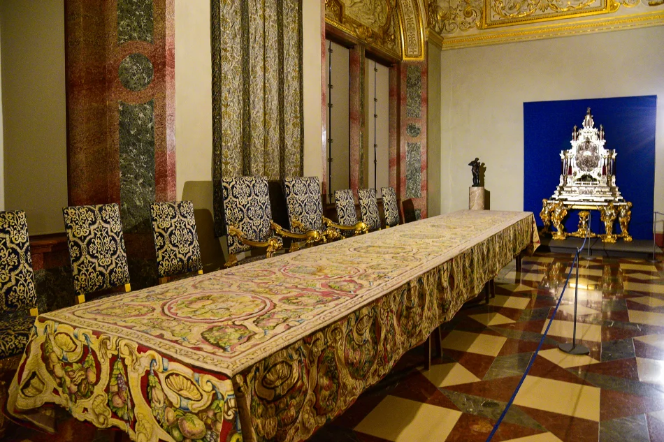 既然是宴會廳,中間也擺放一個桌子當成君主的餐桌,在某些場合他必須在眾目睽睽下用餐,還真的是不好當!這邊也是宮殿內最好拍的地點,建議用廣角跟中焦段嘗試不同的構圖。如果當天有特殊場合,這邊就不開放了,只能遠遠的欣賞陳列擺飾。