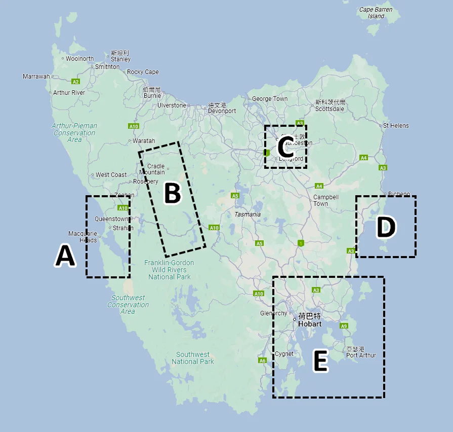 - E:荷巴特、亞瑟港、布魯尼島、瑪麗亞島