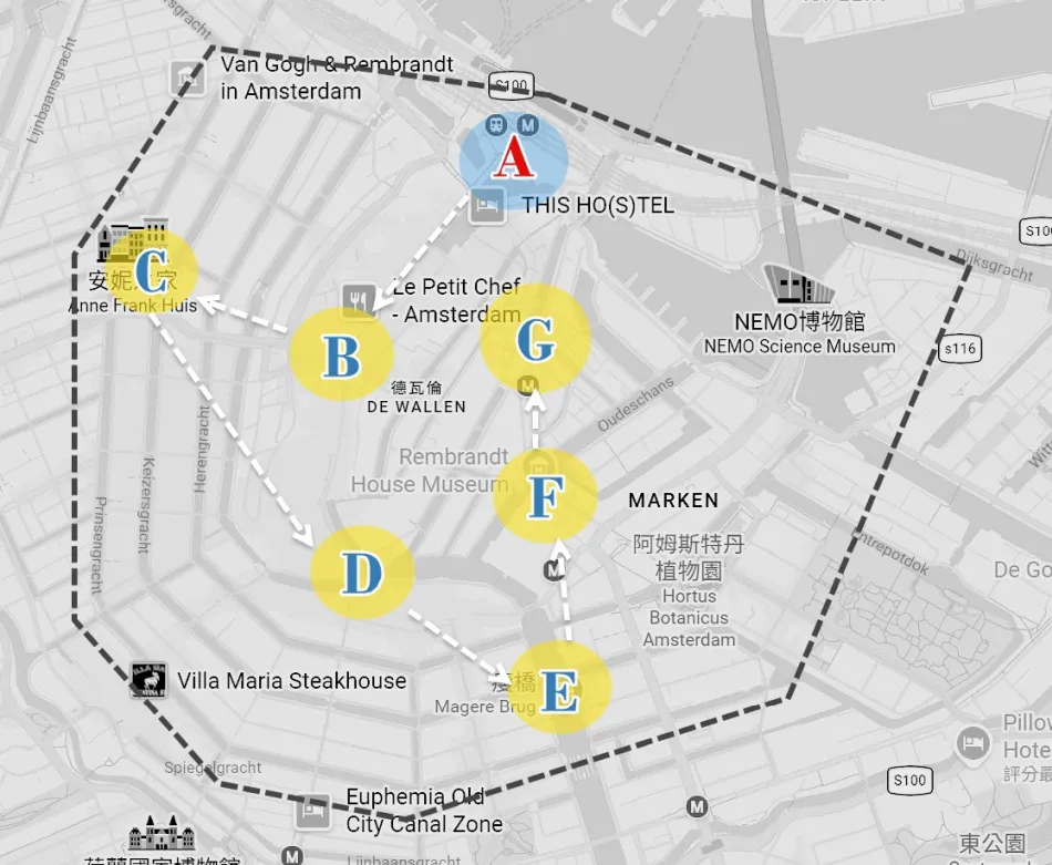 本文介紹的阿姆斯特丹景點都在運河區內、可以全程步行。由最上方的阿姆斯特丹中央車站(A)出發後,第一站是水壩廣場,強烈建議參觀阿姆斯特丹王宮,結束之後再逆時鐘先到安妮之家,結束後再一路沿著運河漫步到運河區東邊。