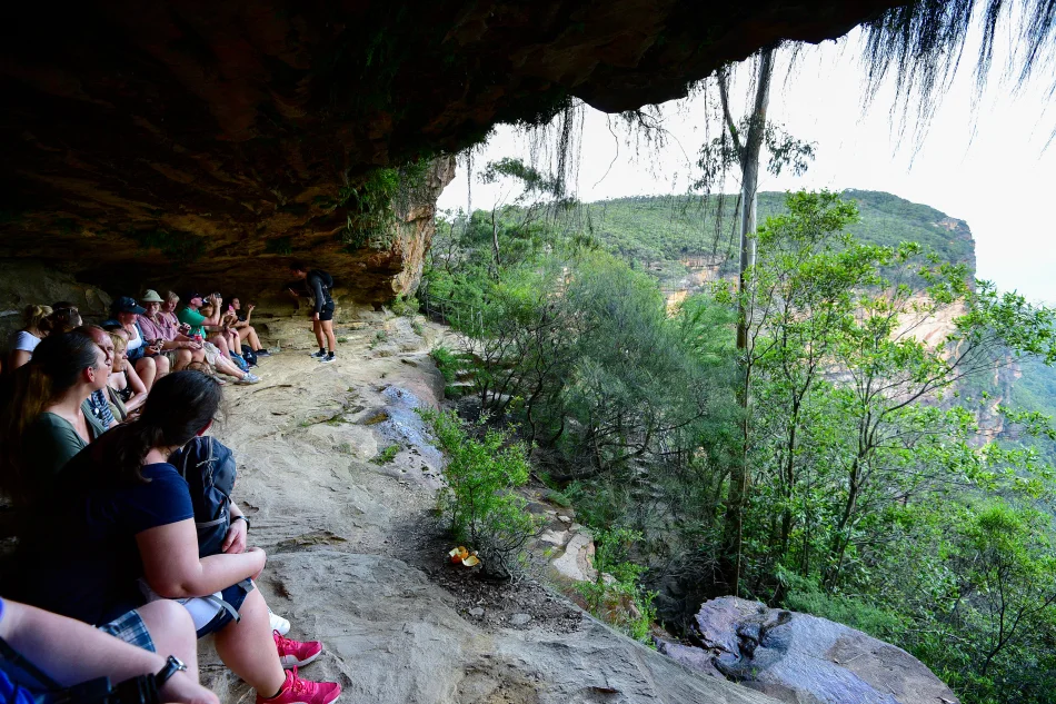 跟澳洲眾多山地一樣,藍山國家公園過往也是原住民生活的區域,不過澳洲原住民是穴居而且沒有文字,低調到很容易讓人忽略,導遊還是帶我們去一個蠻大的凹陷平台休息,順便簡單說明原住民的生活。