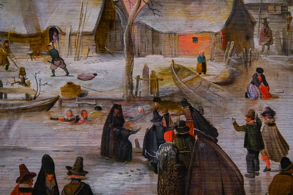 《Ice Scene》(IJsvermaak)是 Hendrick Avercamp 約於1610年完成的作品,此君是荷蘭知名的冬天風景畫家。當時的歐洲泰半區域處於氣候的小冰河期,阿姆斯特丹冬天時運河結冰是家常便飯,溜冰就成了極受歡迎的冬天休閒。
