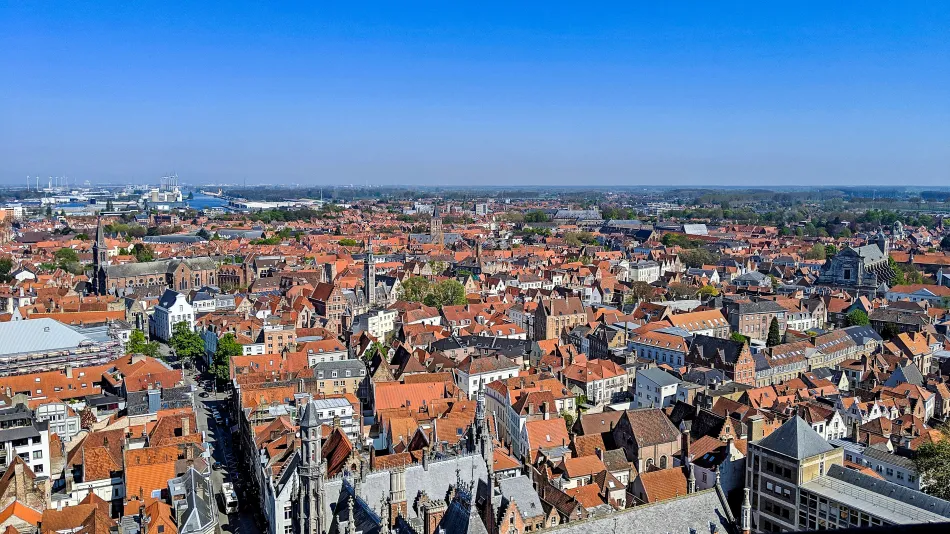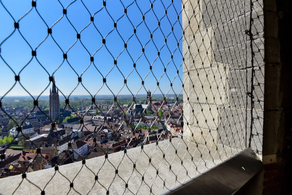 費盡千辛萬苦登到頂樓之後就可欣賞一望無際的布魯日天際線,雖然密密麻麻的紅色屋瓦非常符合旅人對中古歐洲城鎮的想像,但是…有鐵絲網包圍,用手機拍照沒問題,用全幅相機就要看看是否有在四周特定區域開孔讓旅人拍照,我去的時候沒看到。
