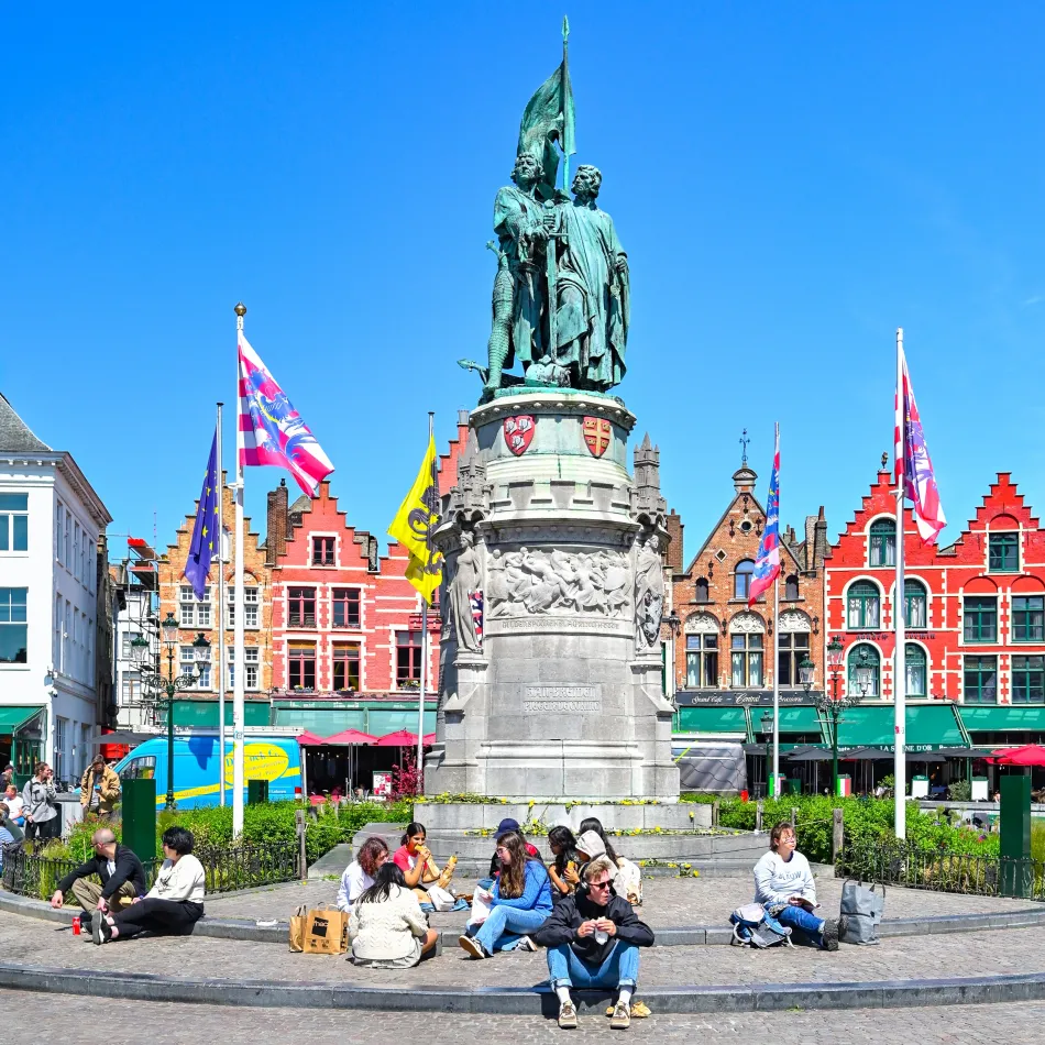 廣場中間的雕像象徵了布魯日輝煌的過去,他們是14世紀時在金馬刺戰役帶領比利時反抗法國的兩位英雄:布雷德爾與柯寧克。略知布魯日歷史的人應該有聽聞當地人曾經因為市場權利問題而囚禁神聖羅馬帝國皇帝馬克西米利安,囚禁地便是市集廣場的克能堡(Cranenburg)。