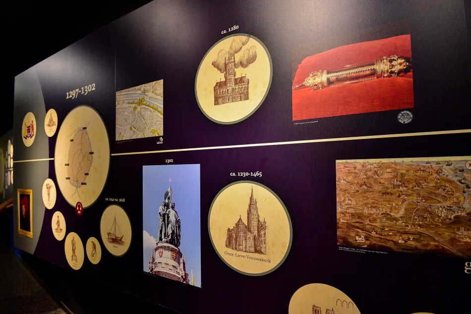看完很有科技感的導覽內容後先不要離開,遵循動線上到二樓後(有地面層,這邊的二樓是台灣的三樓),除了可以看一下看板上介紹的布魯日歷史,也記得要去陽台晃一下,那邊是拍攝市集廣場與布魯日鐘樓的絕佳地點,而且想到這邊一定要購買歷史博物館門票,錯過就太可惜了!