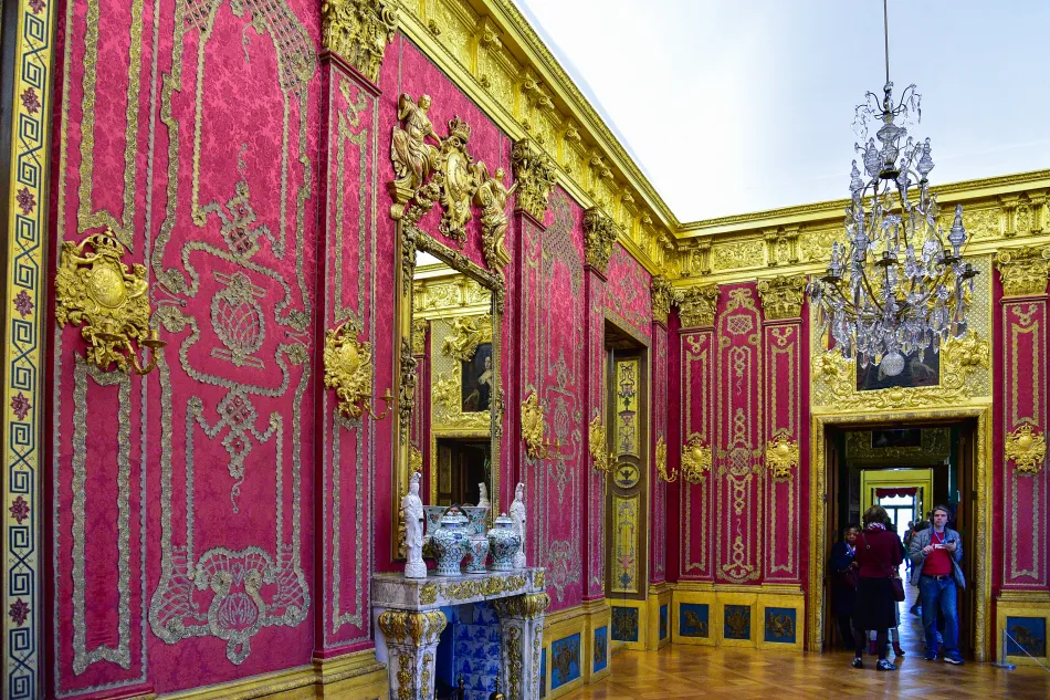 紅大馬士革展廳(Red Damast Chamber):忘記這間展廳跟大馬士革的關係,不過整間是紅通通的,有懸掛夏洛登跟腓特烈一世的肖像畫,這邊在夏洛登主導改建時沒完工,後來為了接待奧古斯都強王跟丹麥國王而變更用途。