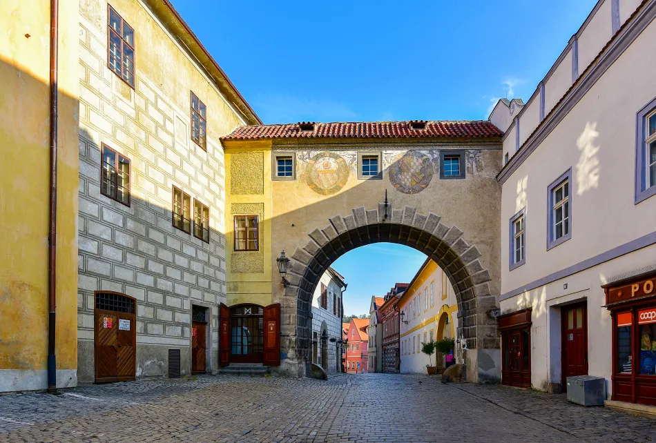 以上是 Latrán 的鬧區,時間不夠的話逛完那區域就好,沿著主要道路繼續走的話可以到舊城區的邊緣:Budweiser Gate (Budějovická Gate),這城門很有趣,面向城內是溫暖的彩繪,城外那邊是貨真價實的磚牆。