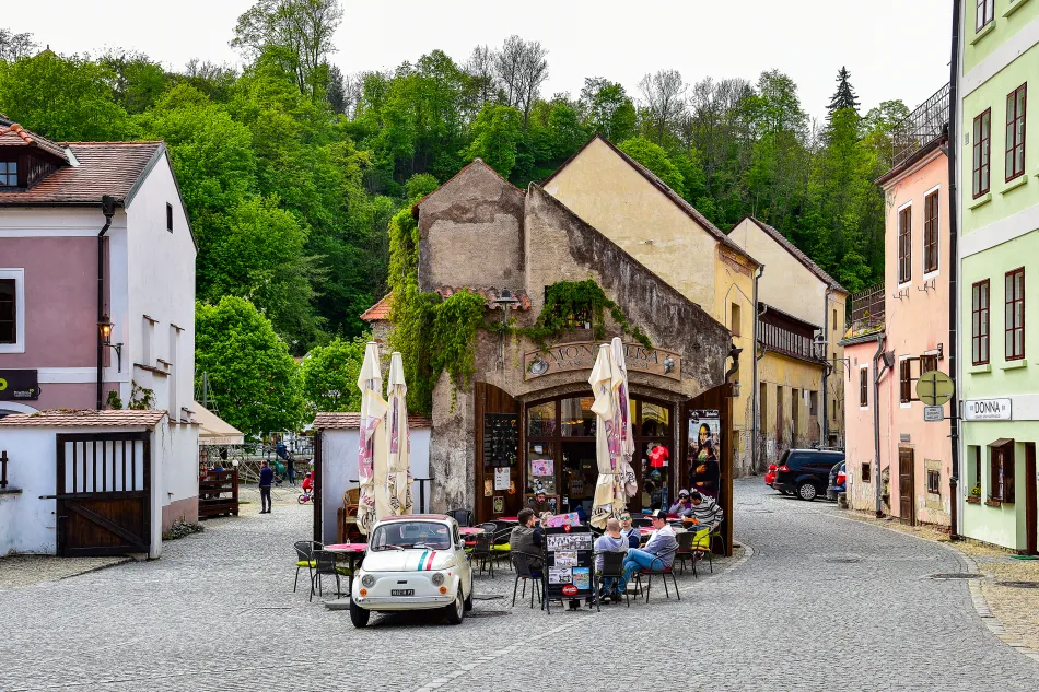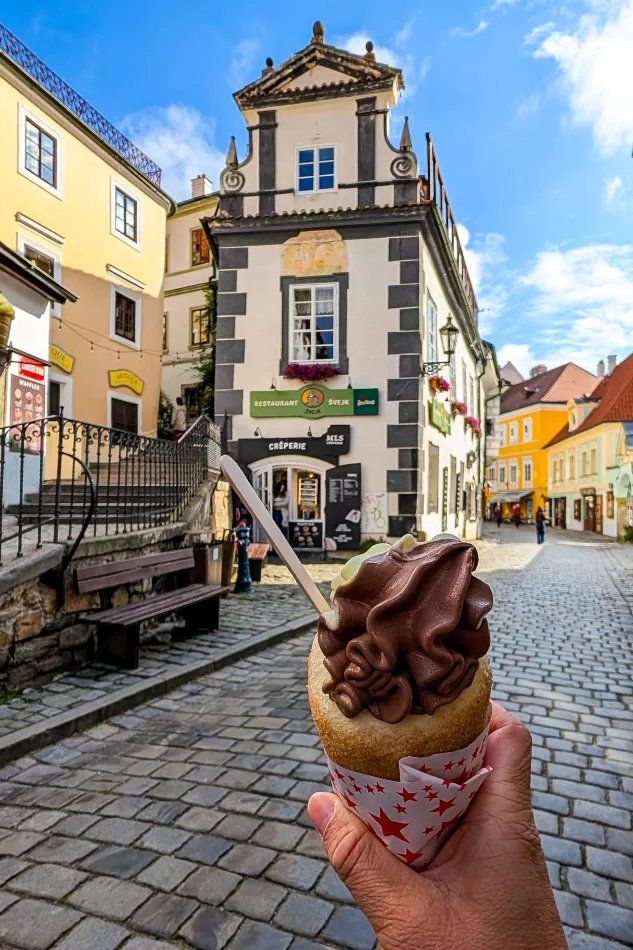 由理髮師橋到紅門(城堡主要入口)的路上是這區域的鬧區,有一些咖啡館跟餐廳,也可以買到捷克的平民美食–煙囪捲(挖空的肉桂捲加上冰淇淋),就在通往城堡另一個入口的叉路上,應該不會錯過。