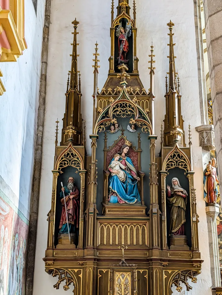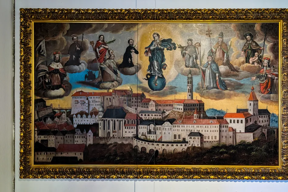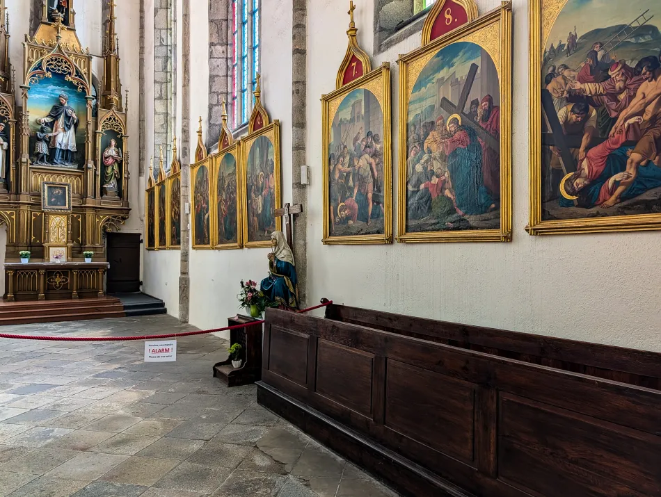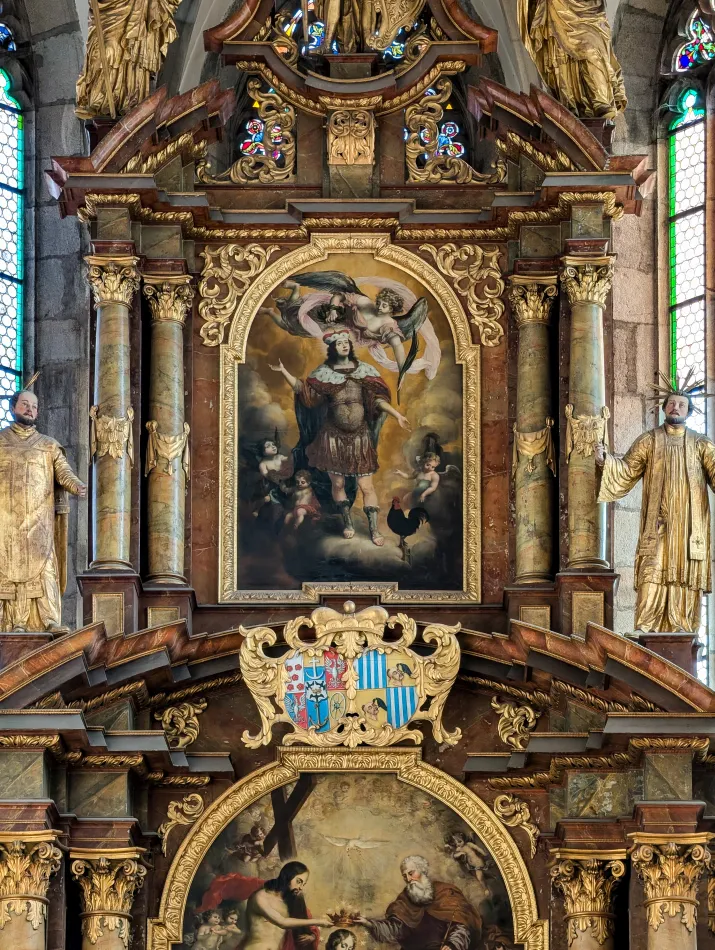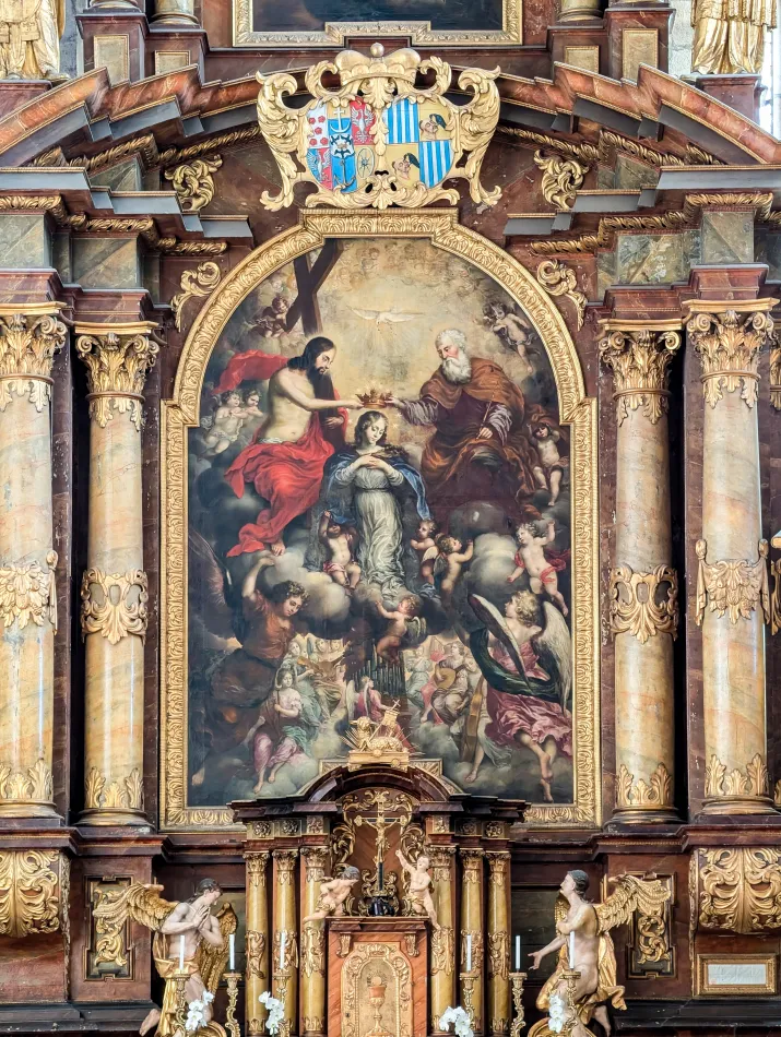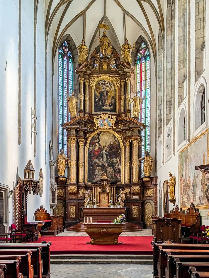 教堂規模不大而且有限制參觀區域,大概花個20分鐘就可以了,最顯眼的是主祭壇,油畫主題是聖母加冕,上面的紋章屬於 Schwarzenberg 家族,其中一個特徵是被烏鴉啄食的土耳其人1。