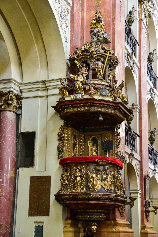 興建於13世紀的聖雅各伯聖殿(The Basilica of St. James/Bazilika svatého Jakuba Většího)原本是供方濟會(Franciscans)使用,原始建築是哥德樣式,在1689年改建後外觀已經很偏向巴洛克樣式,傳聞當時的大火是由為法國路易十四工作的人引發的!