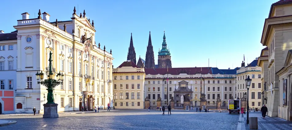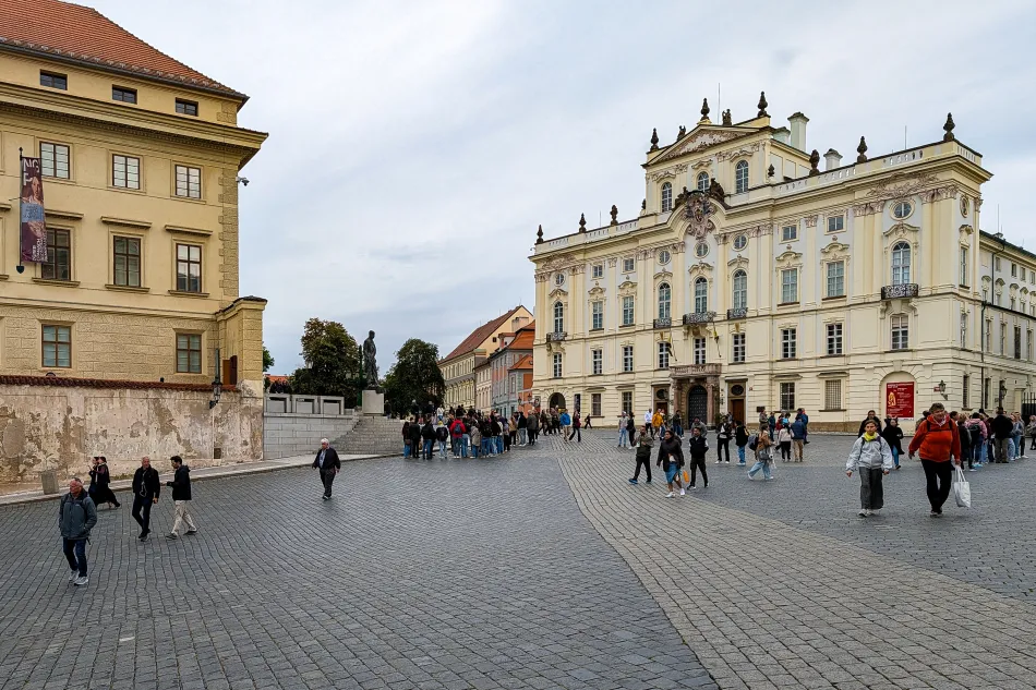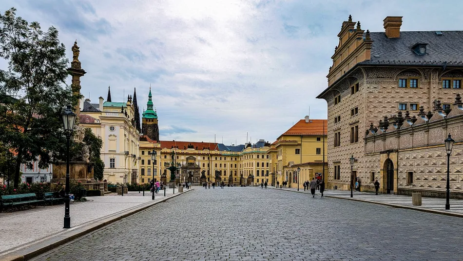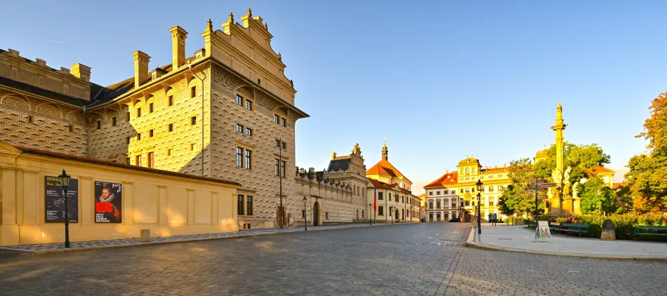 城堡廣場(Hradčanské náměstí)就是布拉格城堡馬提亞斯門前金色鑄鐵大門外的長方形廣場,如果由小城區步行到布拉格城堡都會通往這邊,主要路徑有兩個,終點都是下方的小城廣場,那邊有超多路面電車,蠻多人會由那邊到布拉格城堡。