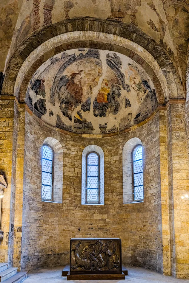位於聖維特教堂後方的聖喬治大殿(Bazilika Svatého Jiří/St. George’s Basilica)是布拉格城堡區現存最古老的教堂,歷史超過千年,經過多次改建之後融合了羅曼跟文藝復興樣式,由正立面看不出來羅曼樣式,登上聖維特大教堂南塔登頂反而可以一目了然過去的建築風格。