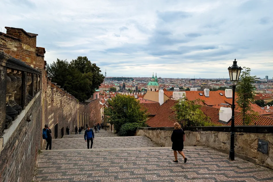舊城堡階梯(Staré zámecké schody)也是到布拉格城堡的熱門路線,由鄰近馬內斯橋的路面電車站–Staré zámecké schody 經由這個平緩的階梯到布拉格城堡後側(東側)入口約15分鐘,可以眺望布拉格城區而且視野比前面介紹的城堡廣場更好。這邊也有一些咖啡館,可以進去喝杯咖啡,視野應該也很好!