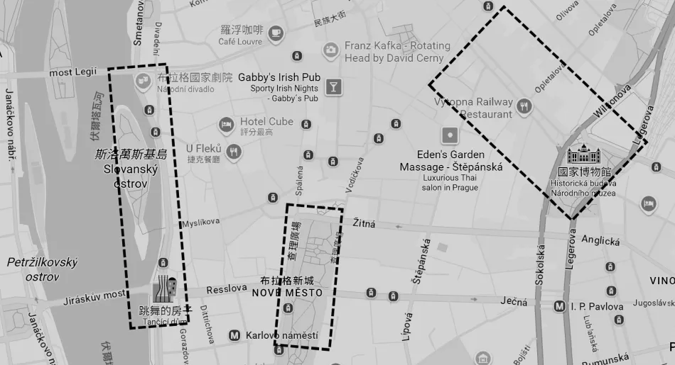 以下提供新城區重要景點位置概略圖,確切位置請參考我整理的 Google Map 布拉格新城區景點位置圖。