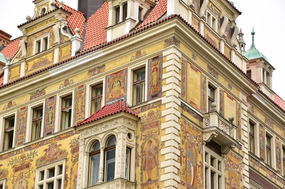 這飯店算是分離派藝術(新藝術的一支)代表作,大體上就是立面由特殊的字型、鍛鐵欄杆、馬賽克拼貼構成。個人覺得…布拉格有眾多新藝術風格建築,這棟其實真的還好,反而是斜對面有棟建築的壁畫很有戲、會讓人看得目不轉睛。