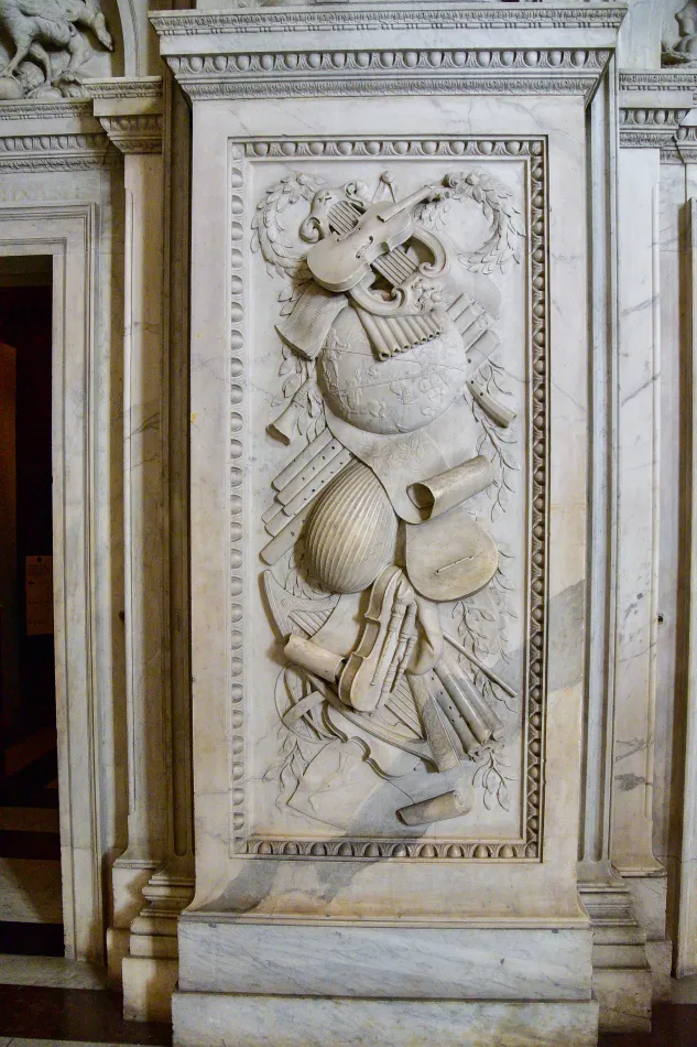 - Citizen’s Hall:門楣跟地板都非常有看頭,兩邊門上是象徵力量的獅子跟象徵智慧的雅典娜,俯瞰地球跟星空,代表了當時荷蘭立國的基礎之一:海外貿易,當時的東印度公司為荷蘭帶進大把銀子
