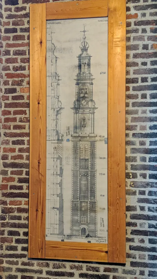 西教堂的參觀重點有兩個:內部跟鐘樓(正式名稱是 Westertoren,即:西塔),先分享鐘樓。想參觀鐘樓得要預約時間,成功預約之後準時到鐘樓入口,跟隨導覽人員登上頂樓觀景台,一定要有導覽人員陪同、不能攜帶大型背包(有寄物處),但可帶相機,只能沿著階梯登上去,沒有電梯。在登上觀景台前導覽人員也會解說一些西教堂鐘樓的典故,例如: