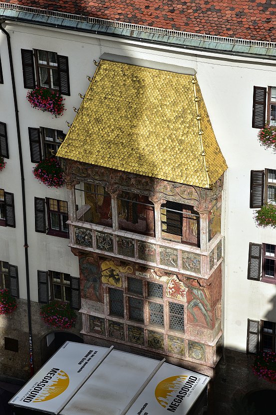 位於因斯布魯克鬧區的黃金屋頂可說是因斯布魯克最知名的建築,神聖羅馬帝國皇帝馬克西米利安一世居住在因斯布魯克時,為了慶祝他的第二次婚姻,蓋了這個由2657塊鍍金銅磚組成的黃金屋頂,讓他可這俯瞰下面主廣場的活動,外觀有八個紋章象徵他的領地,還有代表神聖羅馬帝國的黑色雙頭鷹跟象徵提洛邦的紅色老鷹,目前的用途就是介紹馬克西米利安一世的博物館。