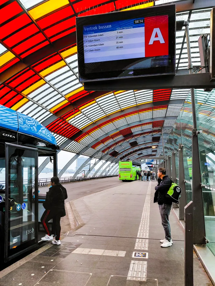 如果要到沃倫丹等小鎮,就有機會一定要搭公車。阿姆斯特丹中央車站的公車站在後站,站名是 Busstation CS IJzijde, Amsterdam。阿姆斯特丹中央車站主要通道有閘門、需要有火車票才可以進出,要到後站區域可利用車站兩側的通道,那是不用過卡的!中央車站的公車站有不少月台,請仔細查看電子看板,上面會說明月台對應的路線。