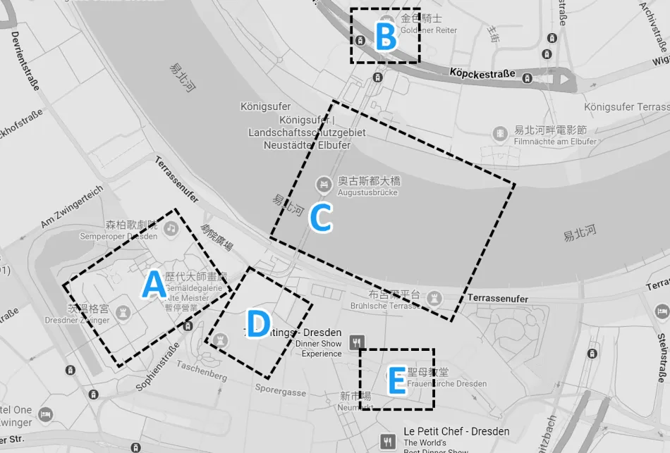 通常由柏林到德勒斯登一日遊是可以全程步行,最遠的距離就是由德勒斯登車站步行到布呂爾露台,約25–30分鐘,路線很簡單。關於這篇遊記的路線圖,可點這個 Google Map 路線連結,易北河畔的景點位置圖如下。