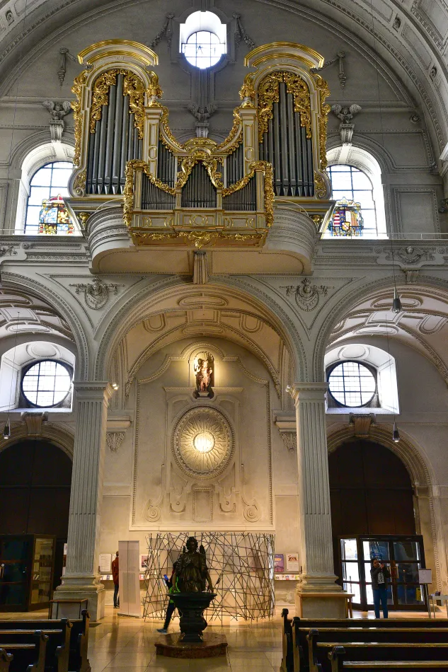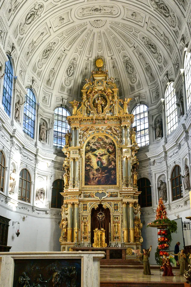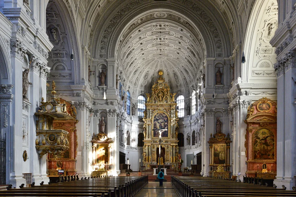 這個教堂內部跟慕尼黑市區北邊的鐵阿提納教堂很類似,雖然華麗,但在歐洲很普遍,真心推薦等等會介紹的阿桑教堂,內部的洛可可裝潢真的讓人驚為天人。教堂的地下墓穴有擺放一些維特爾斯巴赫家族成員的棺木,例如路德維希二世,喜愛探訪墓穴的旅人別錯過了。