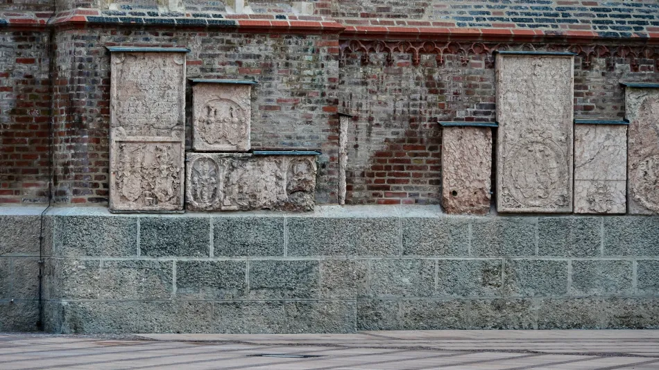 另一個很有趣的就是外牆有不少墓碑,根據我參加的徒步導覽聽到的資訊,以前教堂周遭是墓地,後來因為衛生因素遷到城區外,只有達官貴人才有能力將他們的墓碑鑲嵌在教堂外牆以供紀念(就是要有錢啦)。