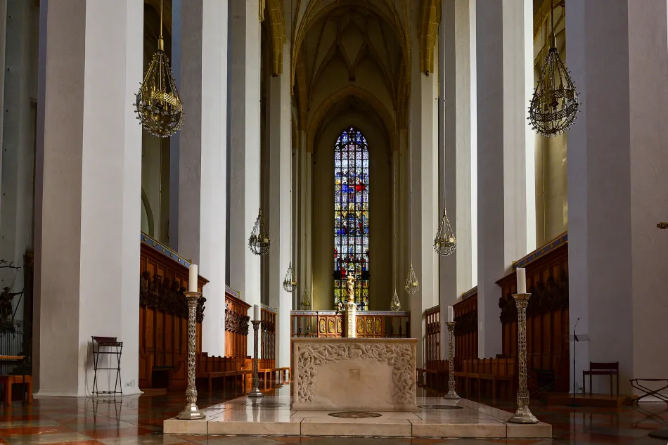 相較於鶴立雞群的外觀,聖母教堂內部可觀之處不多,雖然它是這區域的主教座堂(就是設有主教座位的教堂,俗稱大教堂),但跟慕尼黑眾多建築一樣,在二戰時被炸的體無完膚,直到1994年才完成修復。