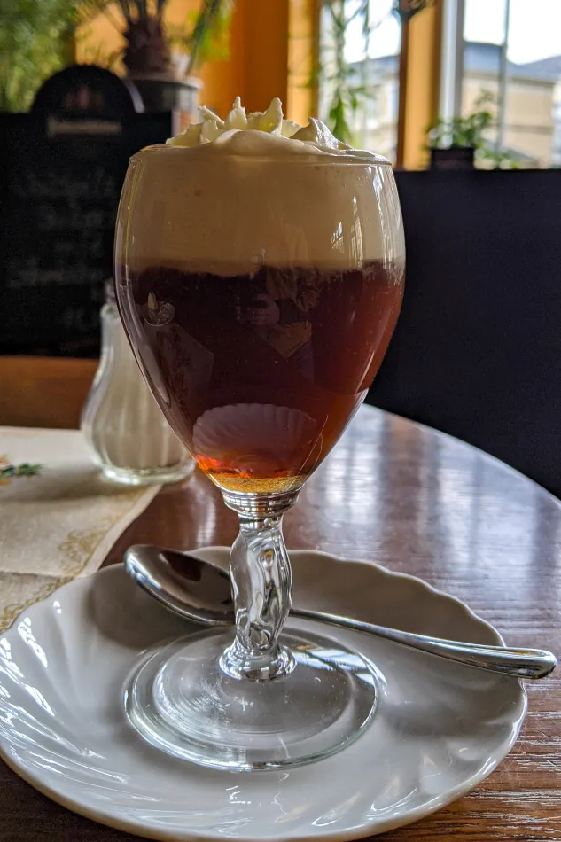 一樓是店面,如果剛好有隨上隨下巴市的遊客下車就會有點壅擠,二樓是咖啡廳,有提供蛋糕、牛奶跟咖啡,如果上一個行程是藍色奇蹟、到這邊是下午,不妨用個下午茶,價格蠻實惠的,除了招牌牛奶,它的愛爾蘭咖啡也非常有水準。