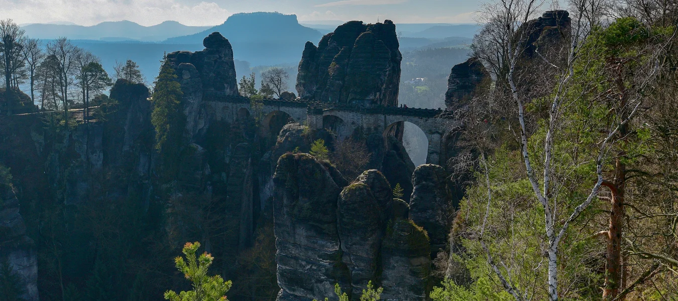 德捷邊境的薩克森.瑞士國家公園(Sächsische Schweiz/Saxon Switzerland,俗稱小瑞士)位於易北河砂岩地帶,被侵蝕之後形成奇形怪狀的斷岩峭壁,落差高達100公尺,其中最有名的為巴斯泰橋(Bastei Bridge),是德勒斯登(Dresden)非常熱門的近郊景點。由市中心搭S1到Kurort Rathen, 約35分鐘,下車後搭渡輪便可到對岸開始健行之旅。