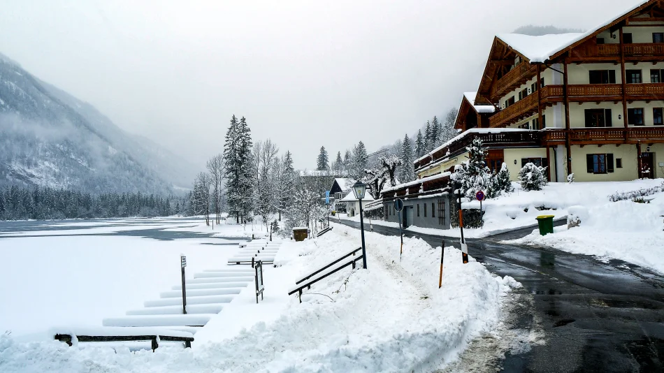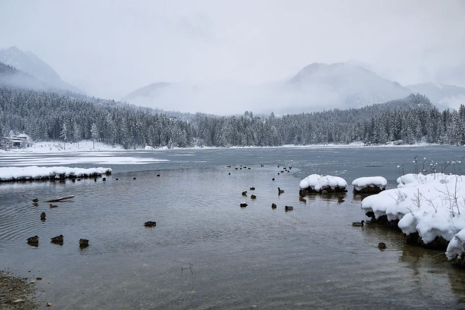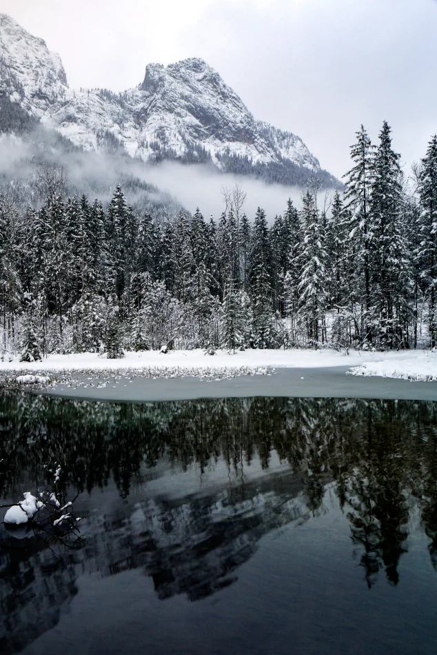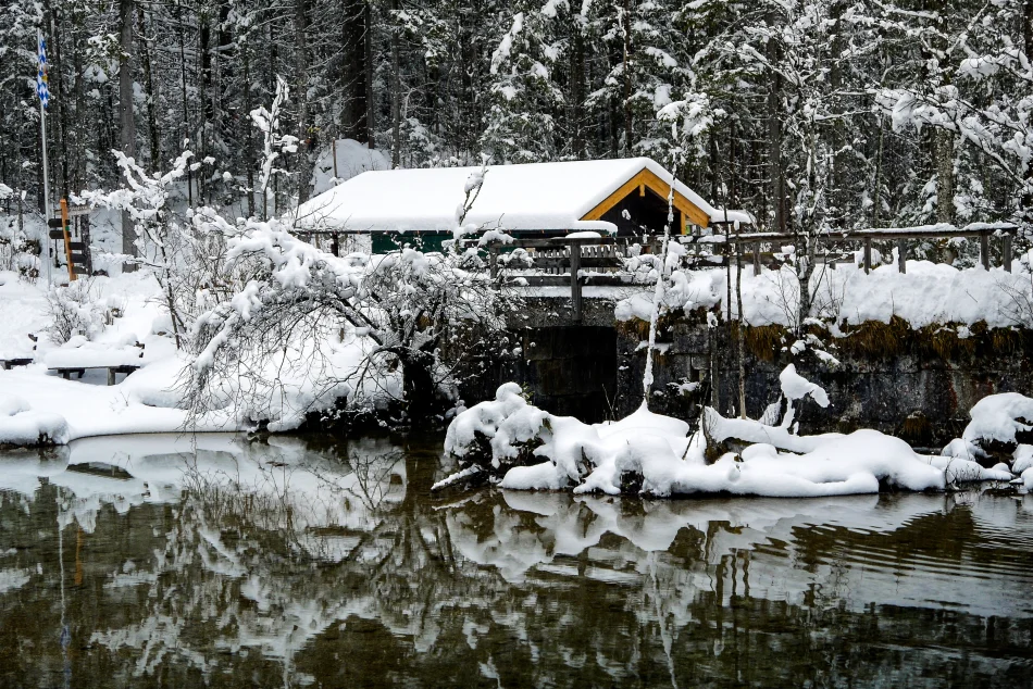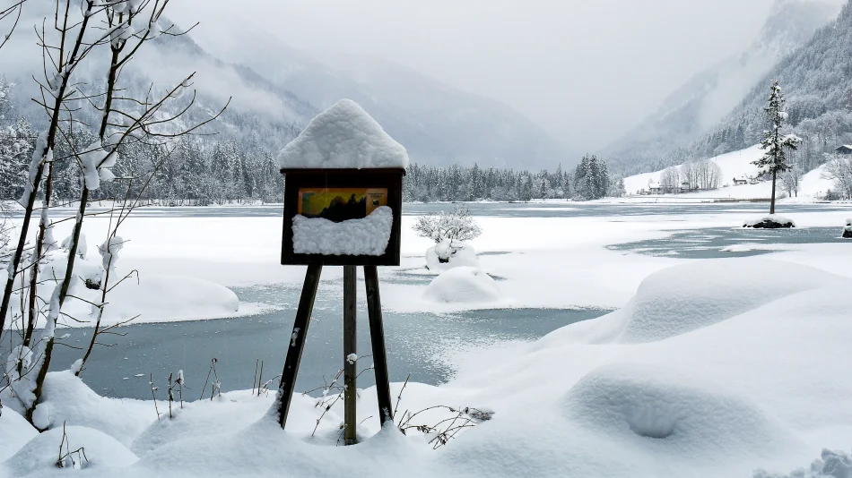 到辛特湖(Hintersee)的主要交通工具也是公車,離藍紹約12分鐘、可順道造訪,喜歡健行的人可以考慮由藍紹沿著魔法森林步行過來,如果搭公車的話就是於辛特湖停車場下車。這邊主要的行程是繞湖健行,走一圈約需1–1.5小時。我來的時候積雪很多、不敢亂走,只沿著步道走一圈、沒四處探訪。