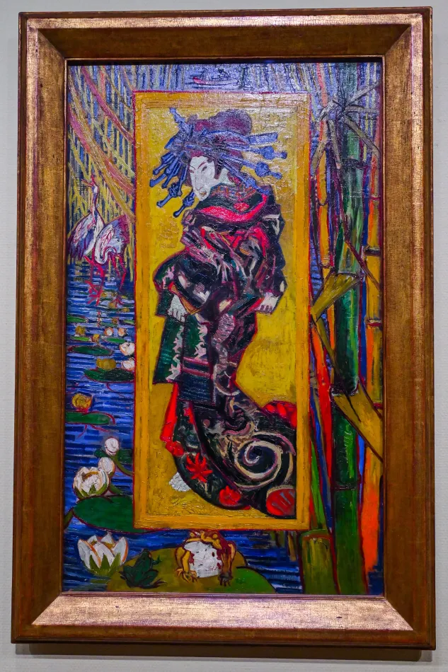 梵谷在這時候也迷上日本浮世繪的畫風:線條簡單、顏色明亮,博物館也展示一些梵谷參考浮世繪而創作的繪畫,我最喜歡的是《雨中的橋》(Bridge in the Rain,官網的介紹)。