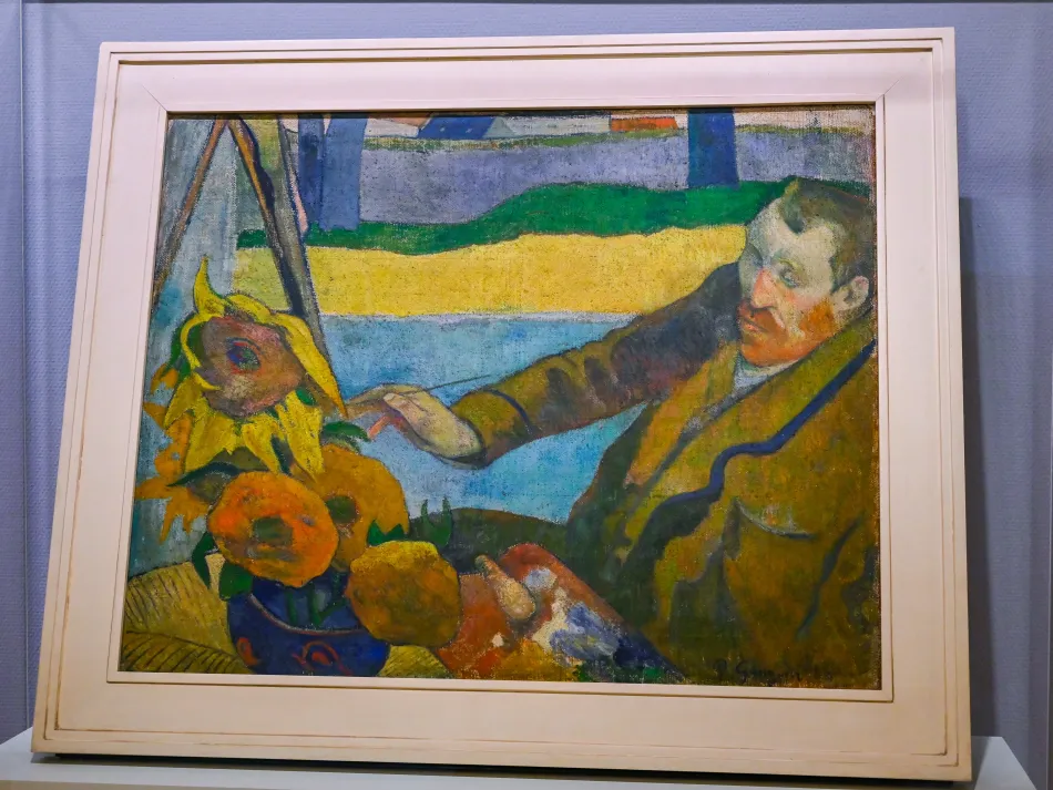在梵谷跟高更鬧翻前他們也有以對方為主題畫肖像,然後梵谷覺得高更把他畫的很詭異、不太滿意,那構圖確實很怪,特別是梵谷持畫筆的那隻手…姿態很微妙,畫中的梵谷非常專注於主題:向日葵。