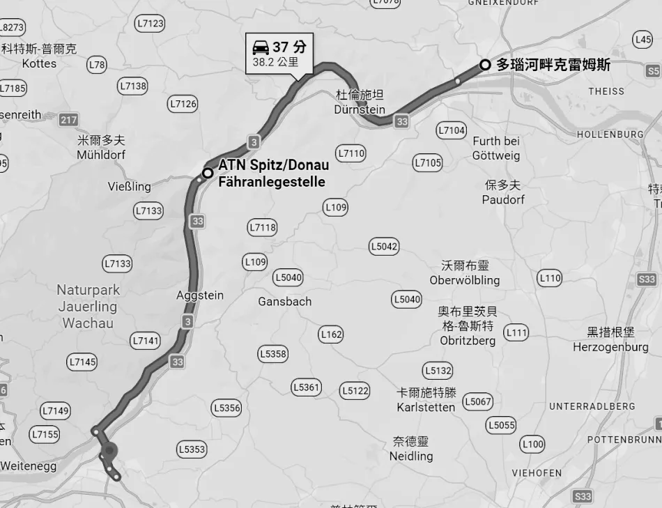 - 路線:克雷姆斯–施皮茨–梅爾克(Google Map 行車路線圖,跟遊船路線幾乎一樣)