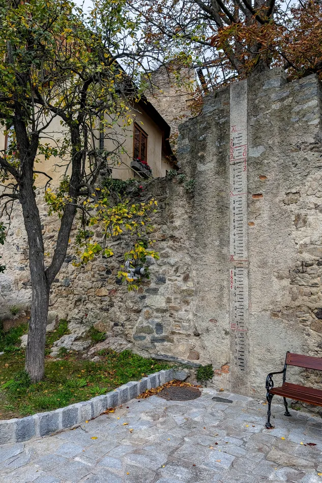 離開杜倫施坦後會經過一個很有趣的地方,就是…多瑙河的水位指標,導遊也有說明某一年淹得特別嚴重。我忘了確切年份,但知道2024年奧地利的多瑙河流域發生嚴重洪災、不少地方交通都中斷。