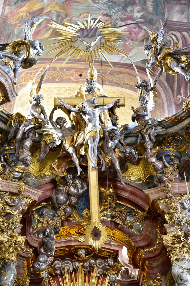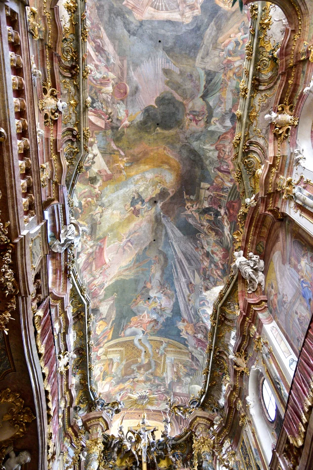 阿桑(Asam)指的是阿桑兄弟:Egid Quirin Asam和Cosmas Damian Asam,這兩位是巴伐利亞非常知名的藝術家,一位專精於壁畫,另一位則是灰泥雕塑大師,他們的另一個傑作就是因斯布魯克主教座堂(延伸閱讀:因斯布魯克市區一日遊)。他們興建的阿桑教堂其內部是讓人膛目結舌的巴洛克樣式加洛可可樣式,天頂壁畫的主角是於1733年封聖的楊.內波穆克(Jan Nepomucký/John of Nepomuk)。
