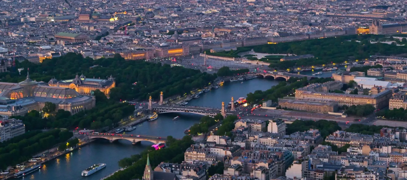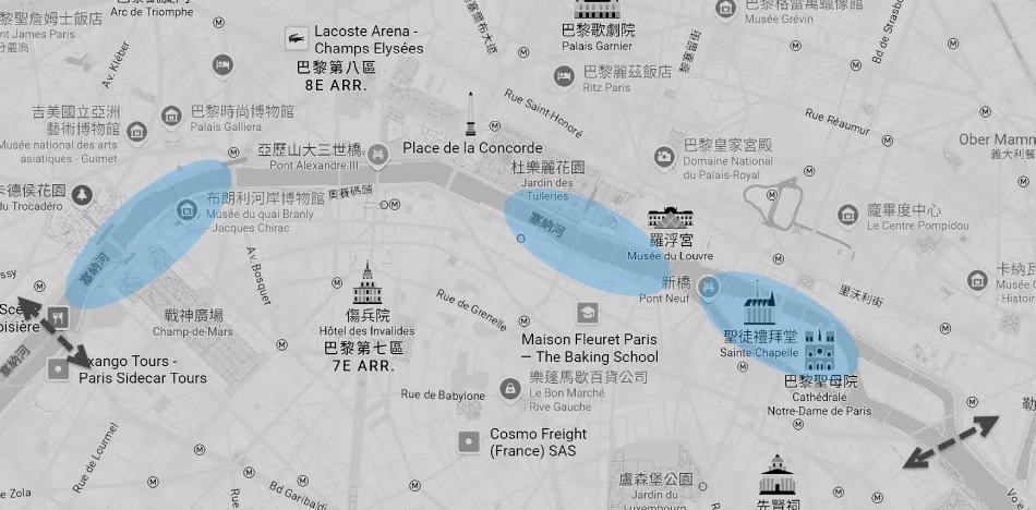 - 兩側箭頭:塞納河遊船行駛區域,也是主要拍攝路線的兩端