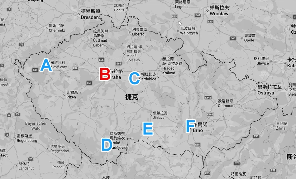 如以布拉格為中樞,相較於往東邊跑(例:布爾諾,開車200公里),我還比較建議安排德國的德勒斯登(開車約150公里)。捷克主要城市位置如下(也可參考我整理的 Google Map),本文會附上這幾個區域的攻略,請先看這些城市攻略、會附上詳細的景點遊記。
