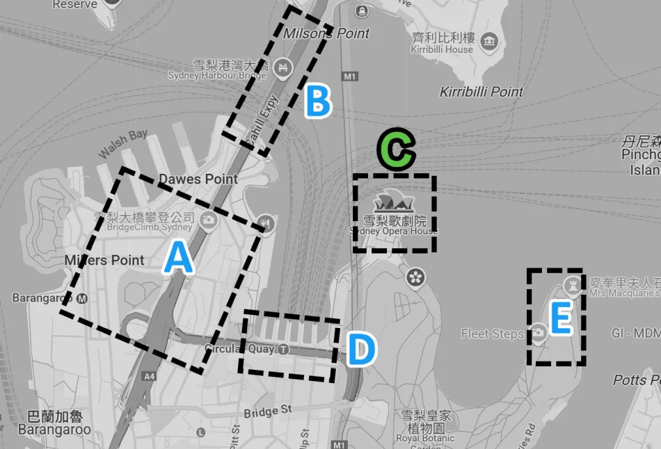 雪梨歌劇院(下圖黑色)地理位置絕佳、位於雪梨市中心的核心地帶,緊鄰環形碼頭、皇家植物園,不遠處是港灣大橋與岩石區。除了本身是非常具代表性的澳洲建築,附近也有不少雪梨必去景點,位置說明如下:
