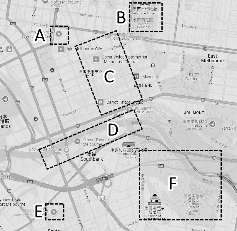 本文介紹的墨爾本市區景點大致分布如下,完整位置圖請參考這個連結(包含本文沒介紹的景點):