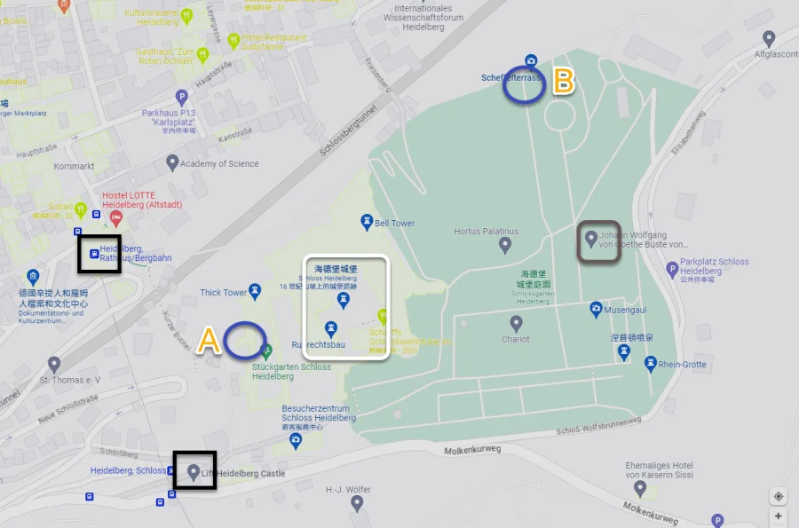 到海德堡城堡最方便的方式就是搭乘纜車,舊城區的上車處(Google Maps位置圖)在穀物市場(Kornmarkt)附近,搭乘約莫5–7分鐘的纜車就可到城堡纜車站,由城堡纜車站步行到第一站:觀景台A約5分鐘、很近。這邊的重點只有一個:拍照,可以捕捉舊城區、卡爾.西奧多古橋的美景,當然也能遠眺對岸的哲學家之道。
