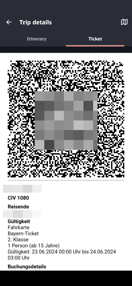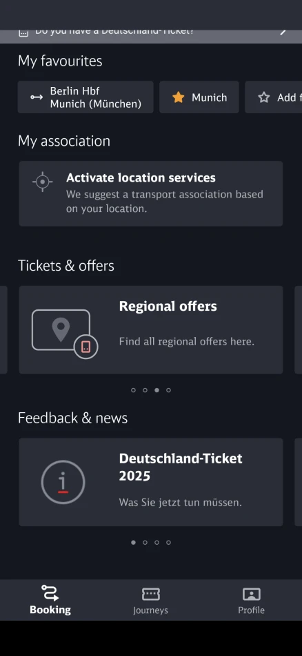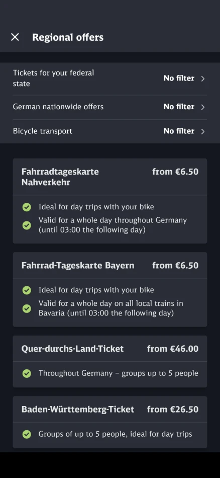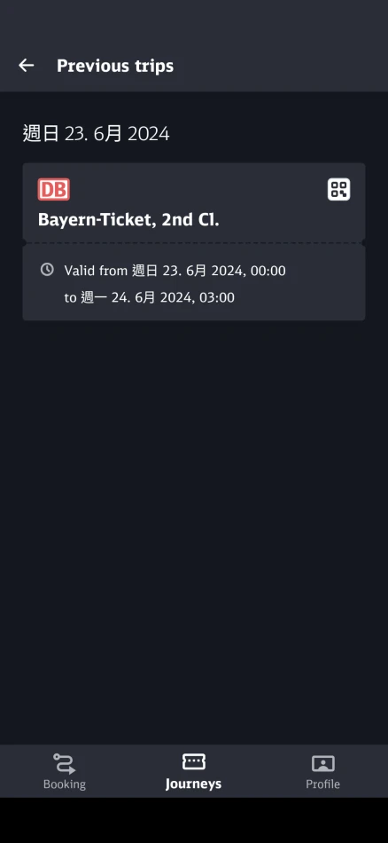 德鐵 APP 超棒的一點就是可以買邦票,趕著上車時很方便,而且不收手續費,買的方式很簡單,在「Booking」下方可以看到「Tickets & offers」,由那邊可以滑到「Regional Offers」,進去後就可以選擇要買哪一種邦票,買的時候就要選定使用時間,不要亂選,車票只有在選定日期才是有效的。買好之後車票會存到前述的車票區域,遇到查票員時開 QR code 給他掃就可。