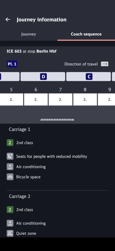 如果點擊「Journey information」也可以看到同樣的資訊,以及列車組成(Coach sequence),建議進車站的時候可以看一下 Coach sequence,會列出列車與月台區域的對應,比較好判斷該在哪邊上車。