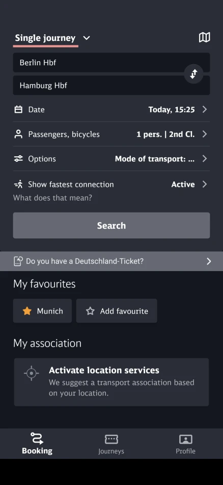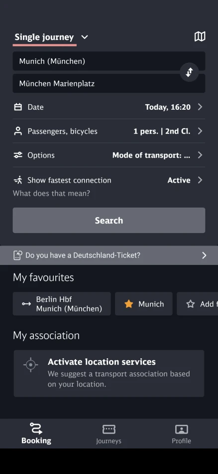 DB Navigator 的預設畫面是「Booking」,就是查詢與訂票。這畫面的左上有個預設值:Single journey,也就是查詢、購買單程車票,若想購買來回票或只要訂位,可以由那邊切換。