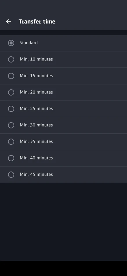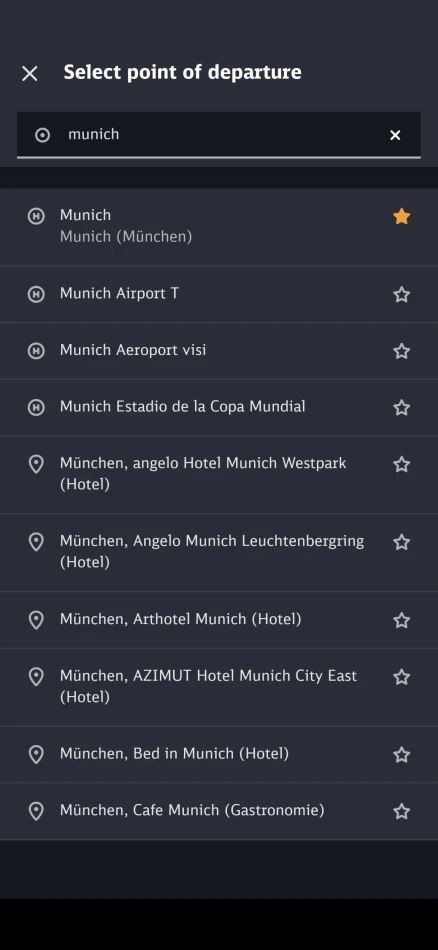 DB Navigator 的查詢結果頁資訊豐富但簡明易懂,很方便我們決定先看哪個路線細節,此外,查詢結果頁右上角的星號是我的最愛功能,點了之後可將本次查詢條件加到我的最愛,之後就不用反覆搜尋/輸入了。如果只是想將車站加到我的最愛,在前述的起迄站輸入畫面中,可於車站名稱旁邊勾選星號、設為我的最愛。