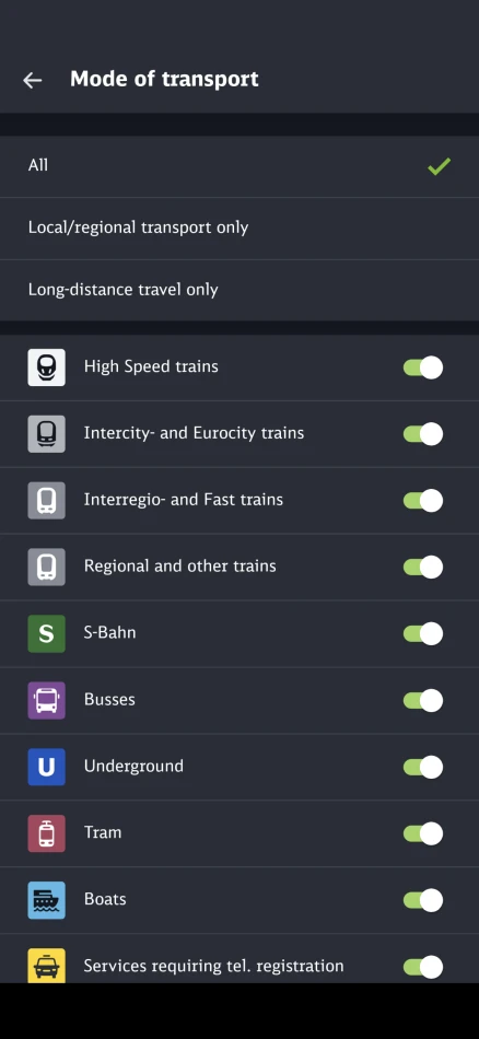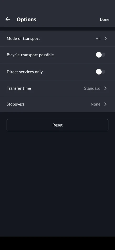 「Options」可選擇要顯示哪些車(Mode of transport),如果偏好搭乘慢車,可以選擇不要顯示 High Speed trains(ICE、TGV 之類的),預設都是顯示最快路線,所以查詢慕尼黑到紐倫堡時通常顯示 ICE,其實是有 RE 可搭的,這時就可由這邊調整。