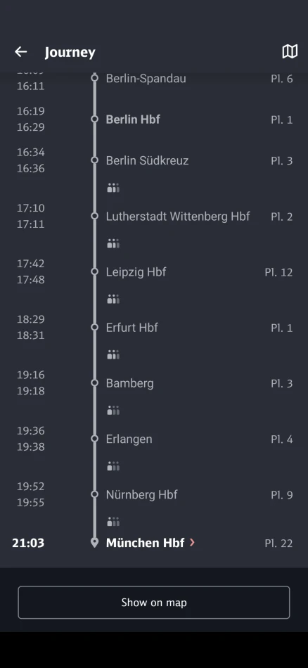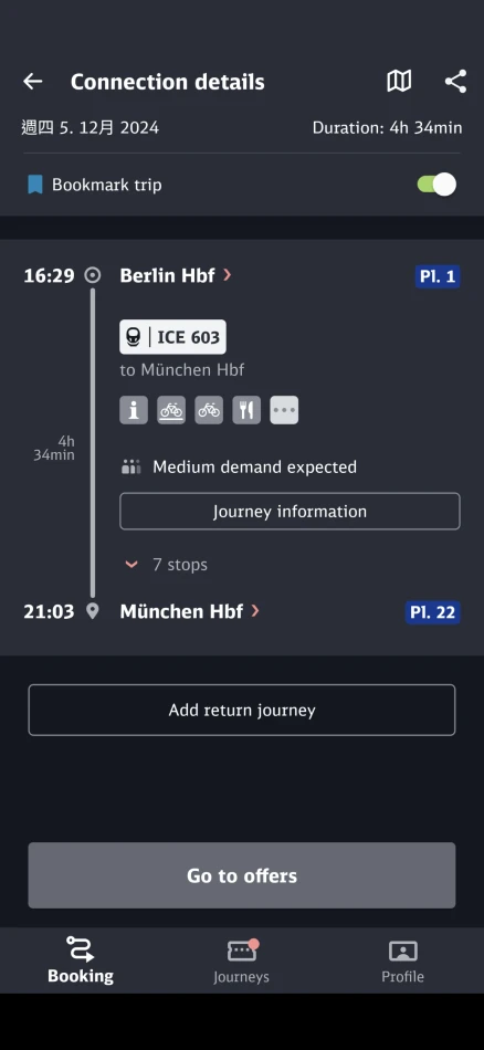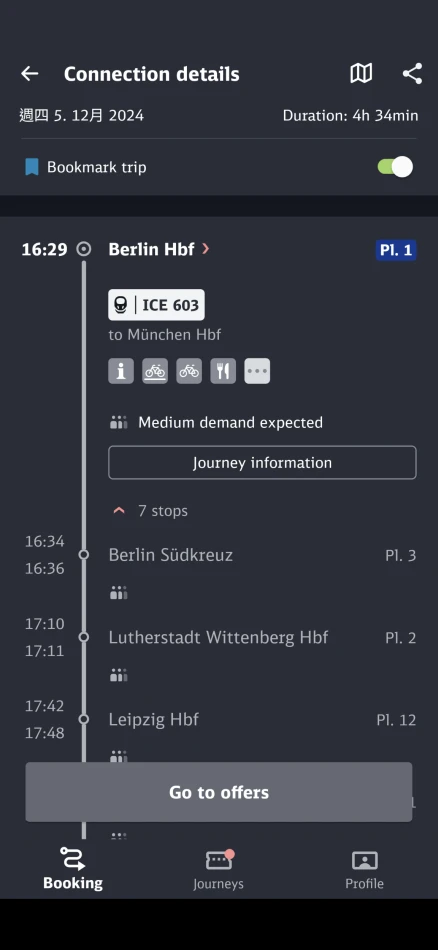 講完上述功能,再來看看行程細節可以看到什麼吧!行程細節(Connection details)中,點向下的箭頭就能看到該班次的各站停靠時間,除了可以看到該班次到我們的目的地,也能看到它抵達終點站的沿途停靠站,誤點時可以用這個評估該在那邊下車轉車…有了這些資訊,就能知道到哪站時該準備下車、班次是否準點、轉車的月台是否變更。