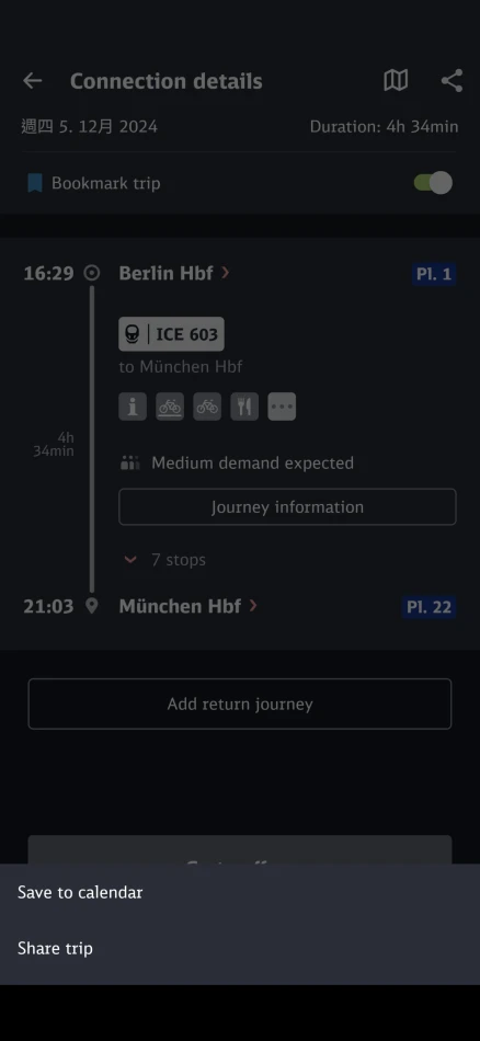 點擊右上角的地圖可以由地圖查看各個停靠點、點擊分享圖示就可以分享給別人或加到行事曆,都很容易使用、不多加說明!如果將這個行程加到書籤(啟用 Bookmark trip)就可以在「Journeys」找到,而且還會開啟通知,列車誤點、更換月台等等都會有提醒,建議將要搭的行程加進去!