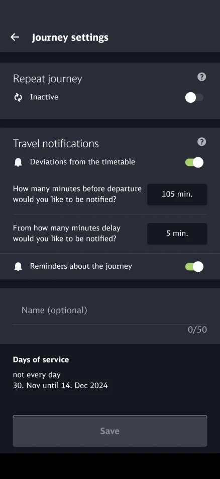 如果有購買車票,或者將行程加到書籤(前述的啟用 Bookmark trip),就可以在這邊找到相關資訊。這邊超方便的,點擊想看的行程後,就可以看到行程的現況、調整行程的通知設定等等,讓我們更可以掌握行程的進行狀況。