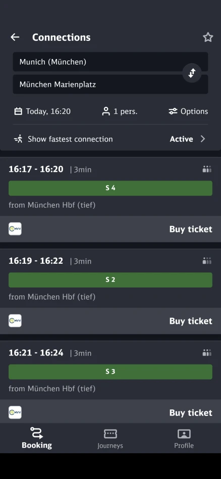 其實站點名稱不是那麼重要,只是要用這個查詢方式進入選擇城市交通票類型的畫面,但有一點要確認:要買正確區域的車票。例如你如果要購買慕尼黑中央車站(M區)到慕尼黑機場(第五區)的城市交通票,就不能輸入你要由慕尼黑中央車站到瑪莉恩廣場(M區),因為慕尼黑市中心到機場是由M區到第五區,其所跨的區域比中央車站到瑪莉恩廣場遠多了。