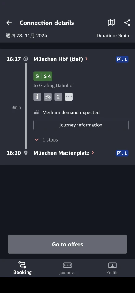 以上的說明都是購買跨城火車票,也可以用這個 APP 購買城市交通票,例如我在法蘭克福或斯圖加特就是用它購買一日票。購買城市交通票的方式很簡單,只要在一開始的畫面輸入 S Bahn 車站名稱、進行查詢,跟著畫面操作下去就會進到票種選項。建議輸入 S Bahn 名稱是因為這 APP 是德鐵的,一定可以找到 S Bahn 車站,但不一定可以找到 U Bahn 或公車站。