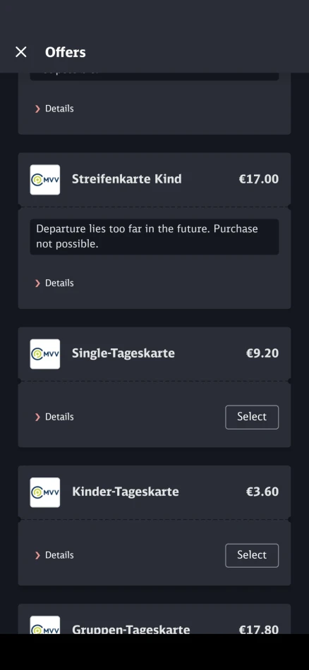若你對當地的大眾運輸路線/分區不熟悉,建議還是輸入正確的出發地與目的地,讓系統幫你挑出正確的車票。車票種類超級多,對德國大眾運輸不熟悉的話最好先看一下當地交通的詳細攻略好知道該選哪一種,選定之後還可以看詳細說明,確認無誤後再付款,完成之後可在前述的「Journeys」找到這車票!
